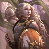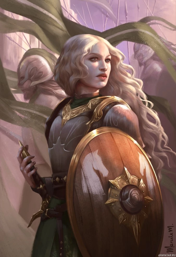 an intricate design on it, suggesting she might be from Middle-earth, possibly referencing the works of J.R.R. Tolkien. The character is depicted confidently looking to her right, as if anticipating