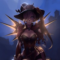 a dynamic pose, giving the impression of movement and action, while also emphasizing Mercy's distinctive features such as her hair and costume accessories.