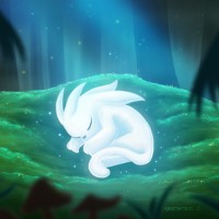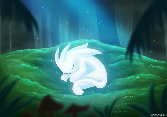 a human figure in the background, suggesting that this could be an important or magical moment for the character. This style is reminiscent of the game "Ori and