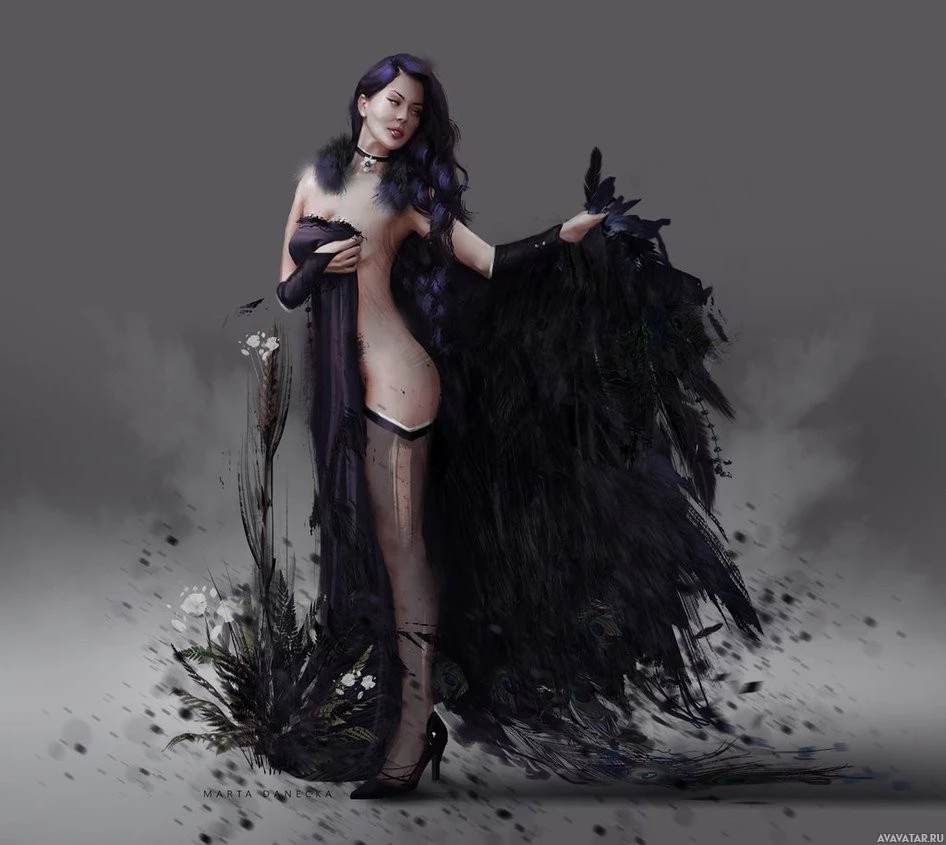 playing games. She has a human-like form but is adorned with various fantasy elements such as feathers and possibly