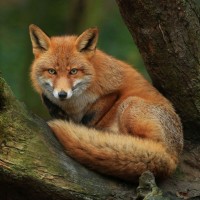 The picture shows a red fox perched in a tree. The animal is alert, with its ears raised and eyes open, appearing to be looking intently at something outside the frame of the image.