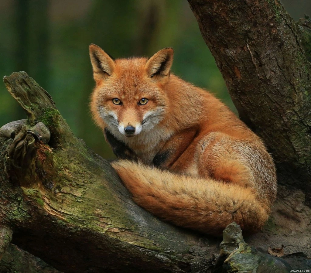На снимке изображена красная лиса, сидящая на дереве. Животное настороженно, с поднятыми ушами и открытыми глазами, кажется, пристально смотрит на что-то за пределами кадра изображения.