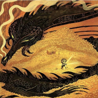 a sense of movement in the dragon's posture, suggesting its presence is imposing and dominating. There is also a small figure on the right side of the image that appears to be Bilbo Baggins from the story, holding