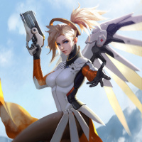 Это цифровое произведение персонажа Мерси из игры Overwatch. Она изображена в полном доспехе и со своим лечащим персоналом наготове. Фон предполагает наружную среду, возможно, во время миссии или тренировки.