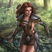 a female character in a fantasy setting. She is wearing armor and carrying a bow, suggesting she may be a warrior or hunter within the context of "The Elder Scrolls"
