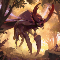 multiple legs like a crab, but also features such as wings and what appears to be a fiery or magical aura surrounding it, which are more characteristic of a fantastical or mythical being rather than a real-world animal. This creature is situated in a forest setting with trees and foliage around it, suggesting a wild or natural environment. There is also a figure on the right side that appears to be observing the monster from a safe distance, possibly indicating human presence or interaction within this