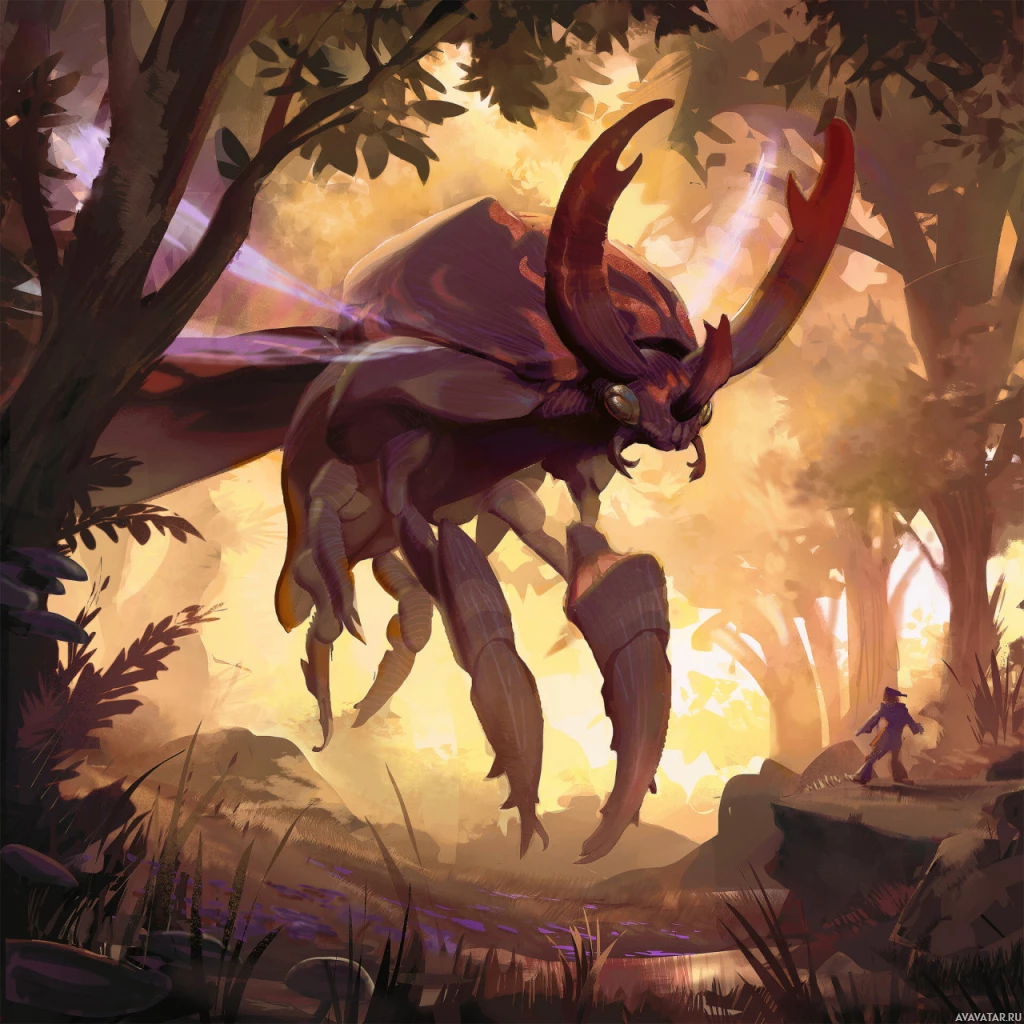 a fantasy scene featuring a large, menacing creature that resembles a mix between a crab and a dragon. It has