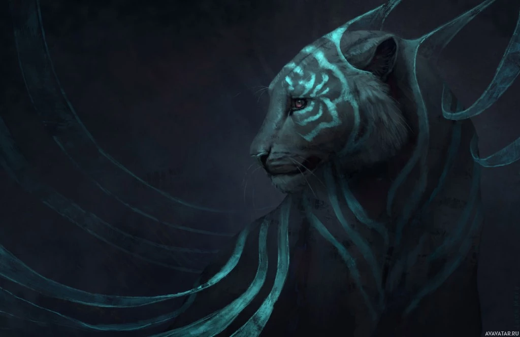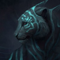 The image depicts a stylized tiger with what appears to be blue or teal markings on its fur. It has a somewhat ethereal appearance, as if it is floating or surrounded by energy. The background is dark, suggesting a nighttime or