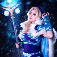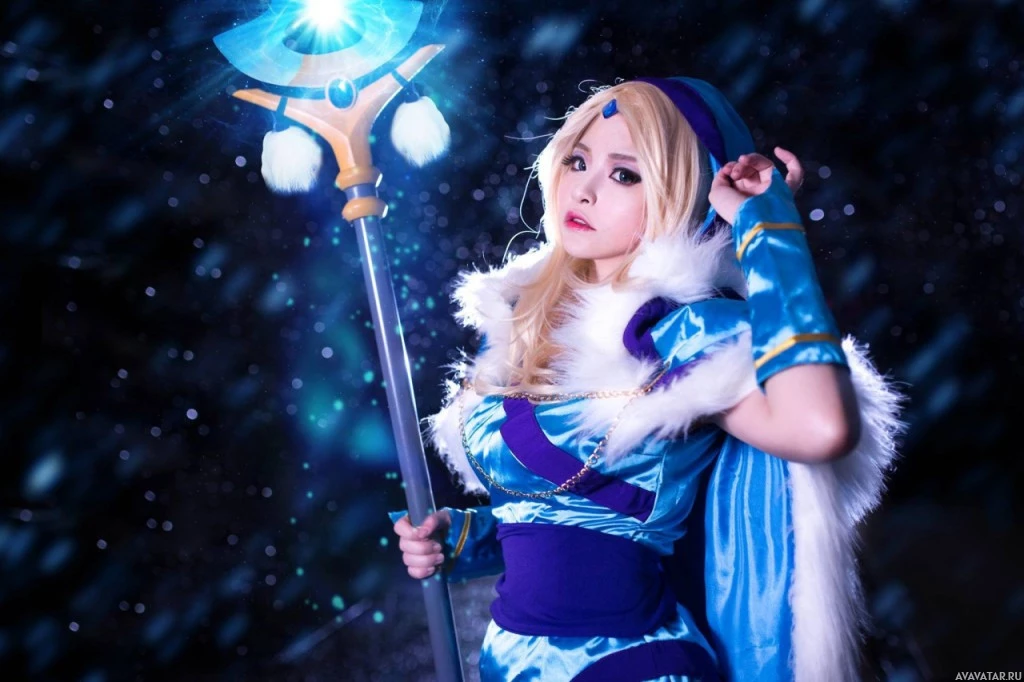 a colorful outfit with a blue and white design, complete with a cape that has a fluffy texture resembling fur. The individual is holding a staff with a crystal at the top, which is consistent with