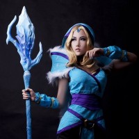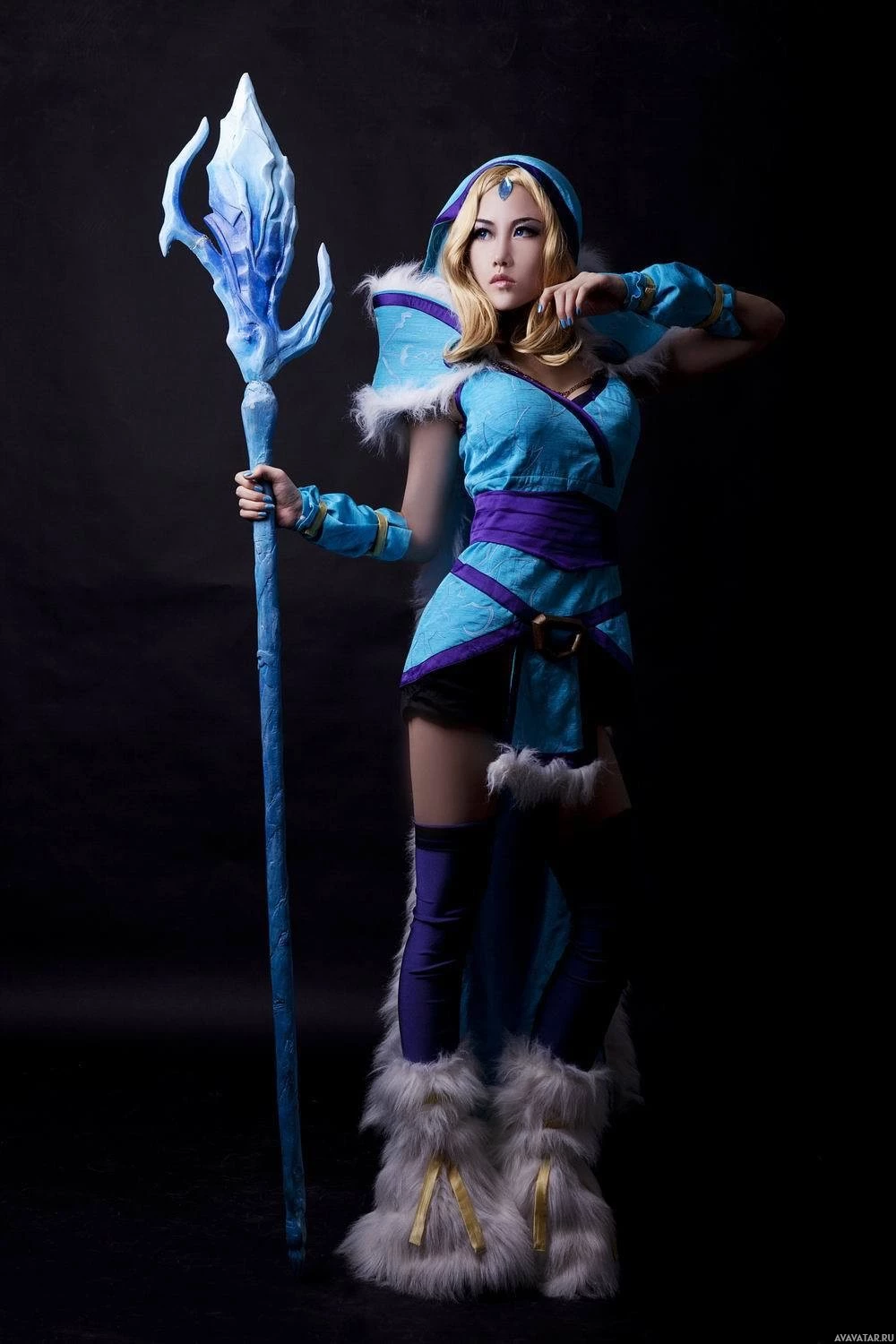 Crystal Maiden from the game Dota 2. The costume includes a fantasy-style outfit with blue and purple tones, fur trimmed boots, and an ice-like staff held in one hand. The person has