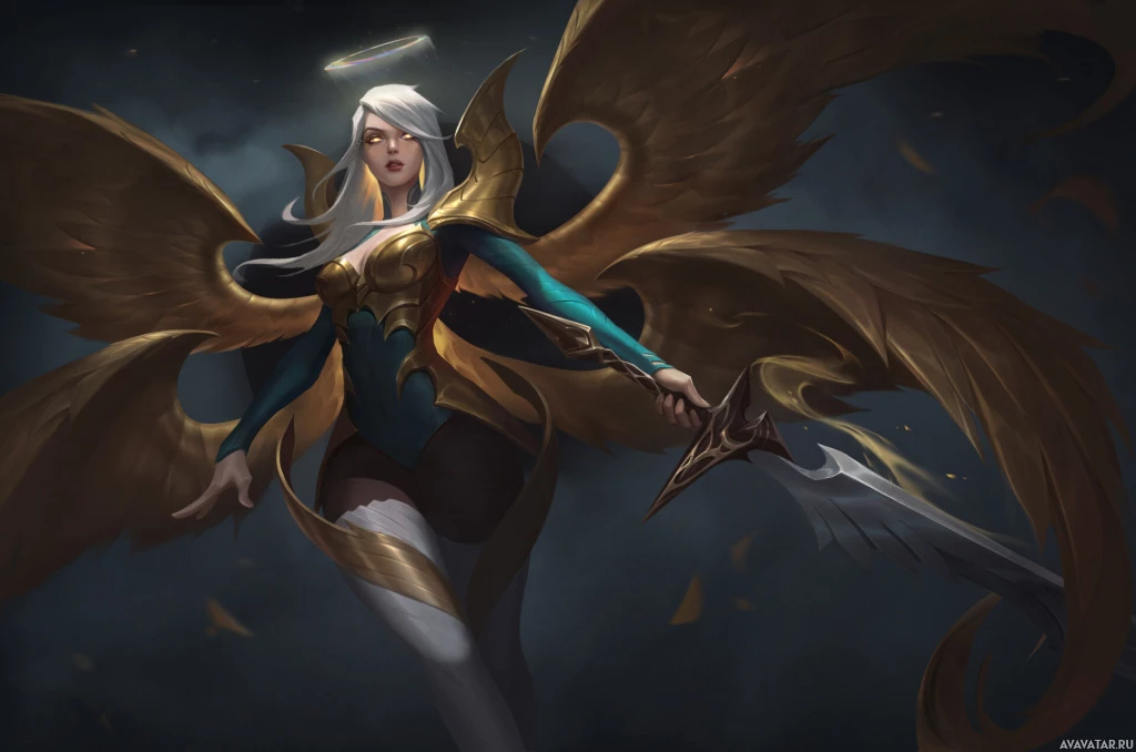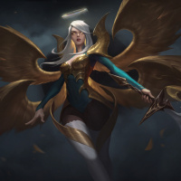 a supportive heroine with a combination of healing and buffing abilities. She is depicted with wings and a halo above her head, suggesting an angelic or divine nature within the context of the game's