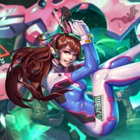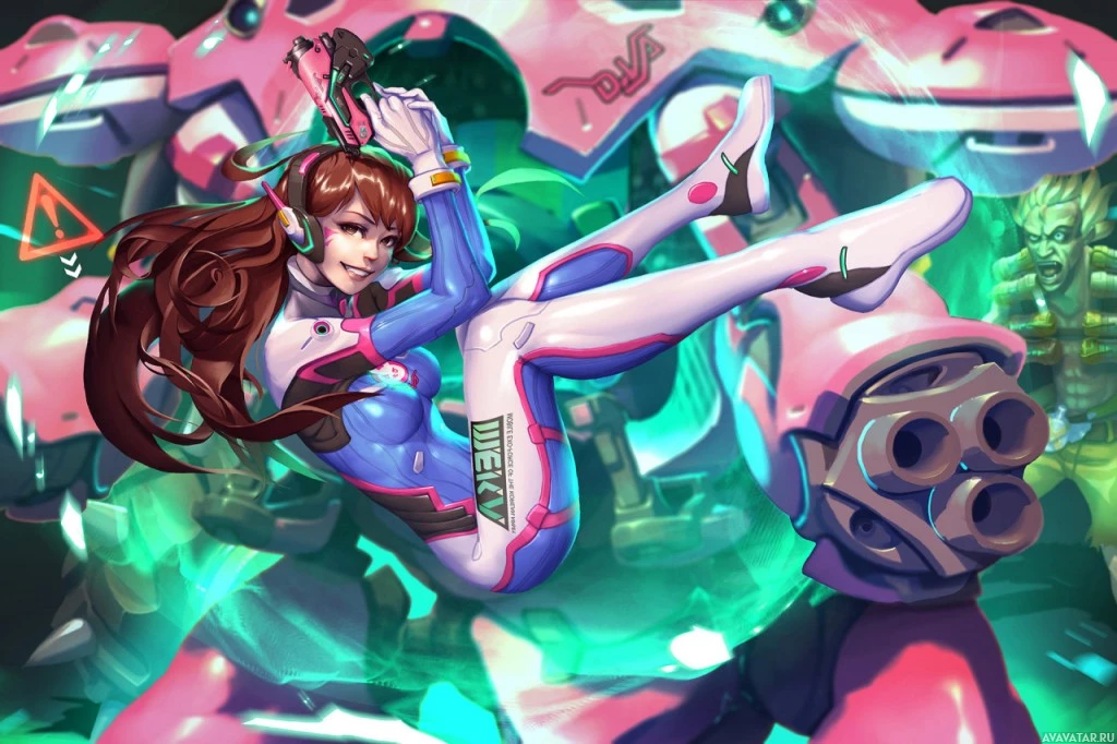 the video game "Overwatch." She is depicted in her iconic suit with a large gun attached to it, and she's shown performing