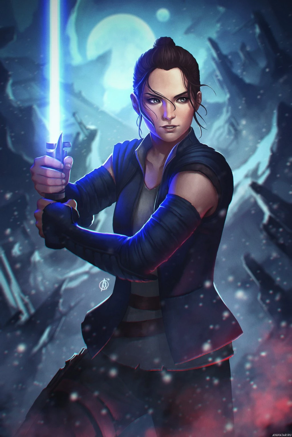 the Star Wars franchise, depicted in her traditional attire: a black outfit with blue accents and a lightsaber. She has her hair tied back and is holding the lightsaber ready for action. The background suggests a dark, possibly volcanic or