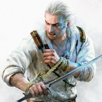 The image depicts a character from the "The Witcher" game. This is Geralt of Rivia, a monster hunter known for his skills and various abilities that aid him in fighting supernatural creatures.