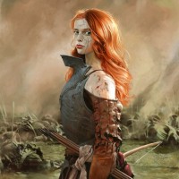 a female character with red hair. She is dressed in what appears to be armor, suggesting she might be from a fantasy or