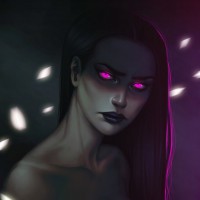 purple eyes which gives an otherworldly appearance. The background features what seems like
