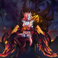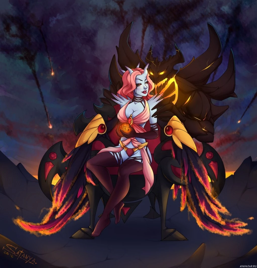 a character from the game Dota 2, known as Queen of Pain. She is depicted riding on Shadow Fiend, another character within the game, which has been anthropomorphized to have arms and legs that resemble