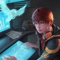 computer monitors around him. On one of the screens, there is a graph displaying some kind of data or analysis. To the right side of the screen, there appears to be a digital representation of a bird flying away, suggesting a dynamic or transient element in the scene. The character seems focused on his work on