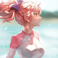 pink hair and red eyes, wearing a sleeveless bodysuit that appears to be pink as well. She is standing in water up to her knees, which suggests she might be at a beach or pool area. Her pose and expression convey a sense of movement or perhaps excitement. The overall style of the artwork is reminiscent of anime or manga illustrations.