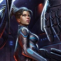 a female character dressed in futuristic armor, which appears to be reminiscent of the game Starcraft. The character is styled with silver and blue colors, suggesting advanced technology or a setting related to
