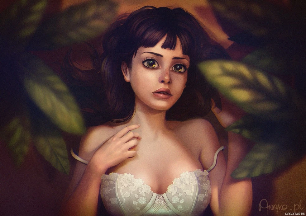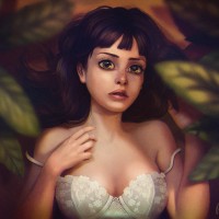 green leaves or plants around her. The style of the image suggests it could be an illustration or digital artwork, and it appears to have a soft,