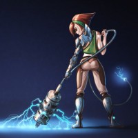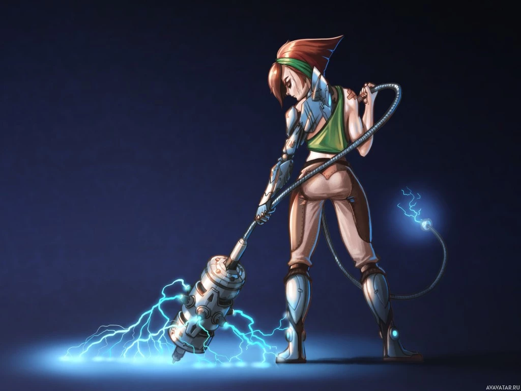 protective gear, which could suggest she is engaged in an activity that requires such attire. In her right hand, she holds a device that seems to emit sparks, possibly suggesting electricity-