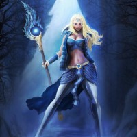 an animated character dressed in fantasy attire, suggesting she is a part of the "Dota 2" game universe. She is holding what appears to be a staff or wand with a crystal at its top. Her pose and expression indicate that she might be portraying a heroic or magical role within the context of the game. The background features an eerie, misty