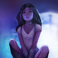 a female character sitting on the ground with her legs crossed, appearing to be in a contemplative or thoughtful pose. She has