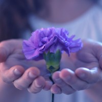 На картинке изображена пара рук, мягко облегающая один фиолетовый цветок. Это обычная сцена, связанная с актом заботы, оценки или празднования маленьких моментов жизни.