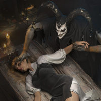 demon character. The setting appears to be an old,