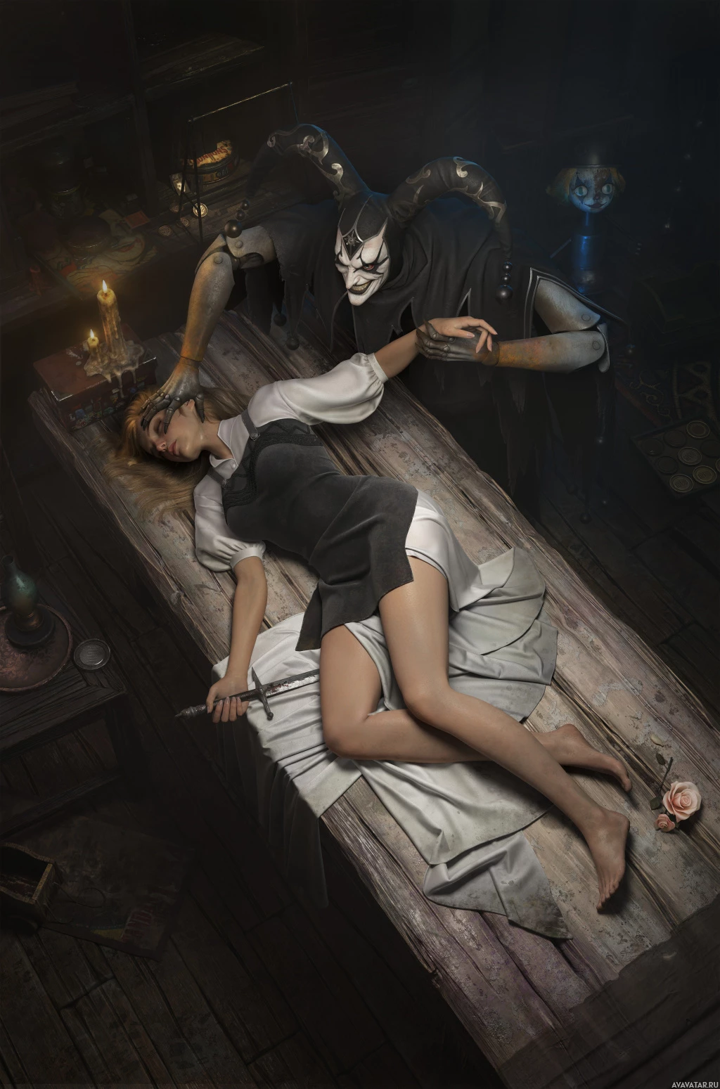 a black dress that seems somewhat tattered at the sleeves. Next to her, standing in a menacing pose with one hand on his hip and the other holding a staff, is a figure resembling a devil or