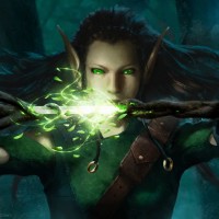 a dark ambiance, reinforcing the mystical or enchanted atmosphere typical of fantasy settings. The image conveys a sense of action or preparation for a battle or confrontation, given the character's stance and the magical energy being used.