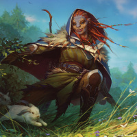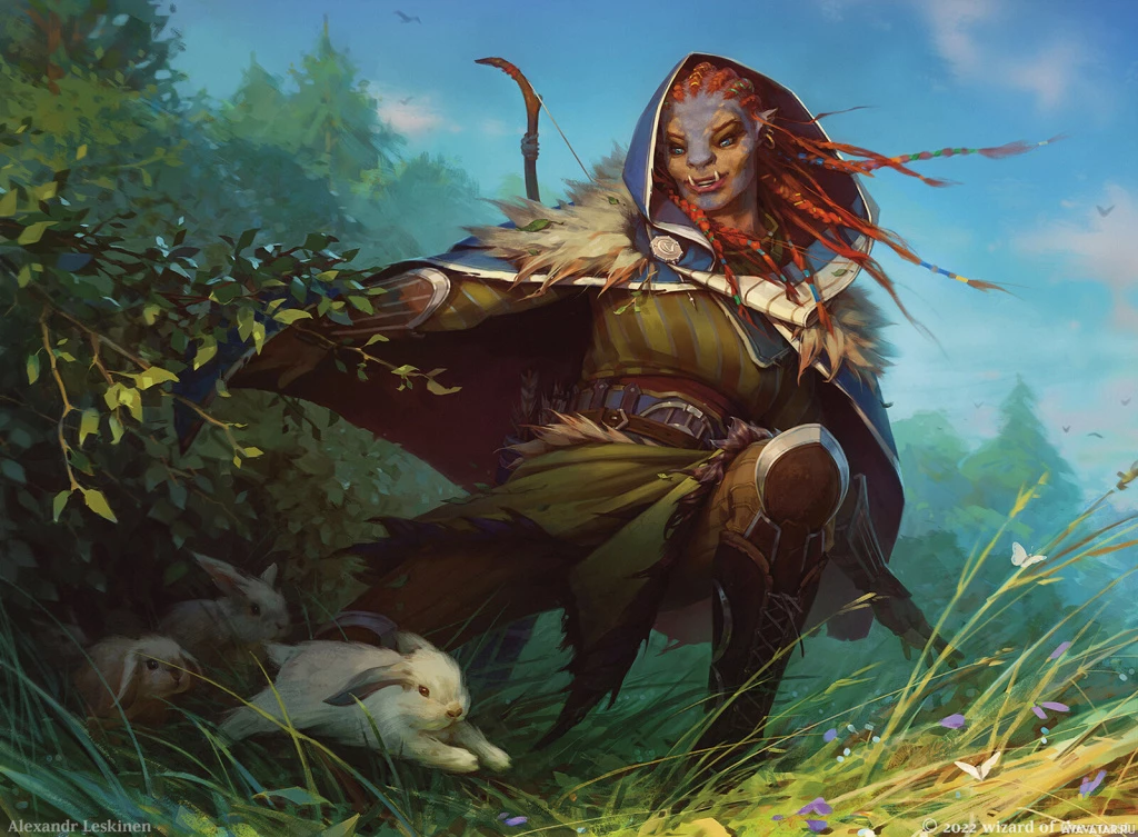 red hair. They are surrounded by nature, with wildflowers visible at their feet and a rabbit nearby. There's also