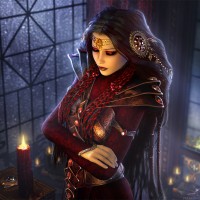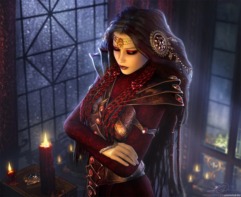 an interior room with candles providing a moody and dimly lit atmosphere, which contributes to the character's mystique and the overall fantastical theme of the image.