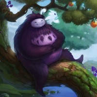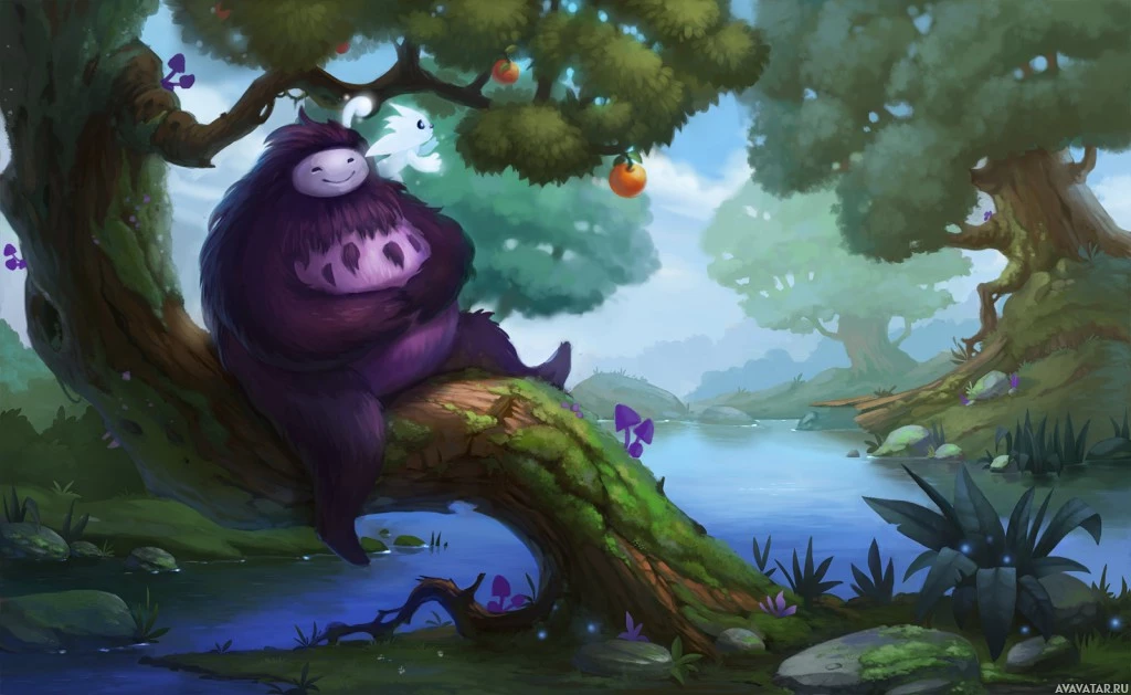 The image depicts a whimsical, colorful scene featuring a character that resembles an Ori from