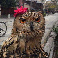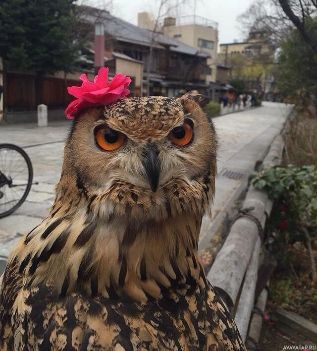 a red flower on its head. The owl is perched outdoors and seems to be looking towards the camera with