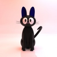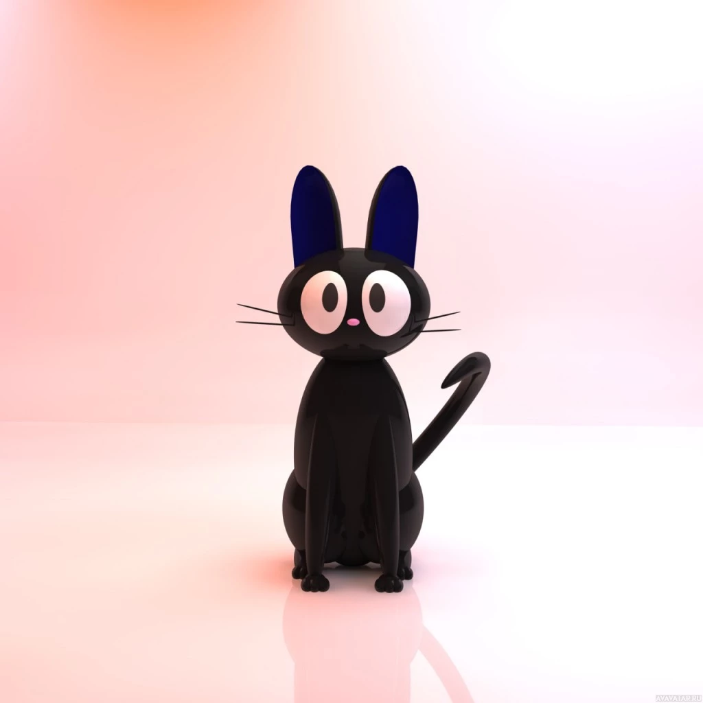 The image shows a three-dimensional rendering of an animated cat character. It has a blue face with large, round eyes and white whiskers, along with a black body with a tail. This style is reminiscent of modern computer animation.