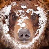 The picture shows a brown bear with snow on its fur. It appears to be looking directly at the camera, and there is a layer of snow visible around it, indicating cold weather conditions. This image captures an interesting moment that showcases the behavior of bears in winter environments.