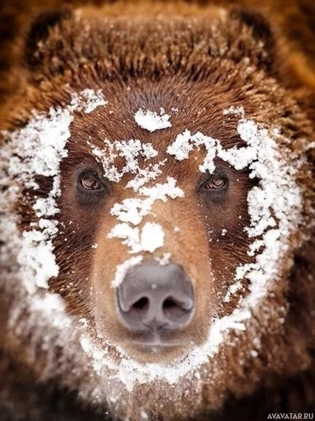 На картине изображен бурый медведь со снегом на шерсти. Похоже, что он смотрит прямо на камеру, и вокруг него виден слой снега, указывающий на холодные погодные условия. Это изображение отражает интересный момент, который демонстрирует поведение медведей в зимних условиях.