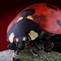 a piece of wood or bark, as suggested by the texture beneath it. Ladybugs are commonly found in gardens and can be beneficial because they feed on