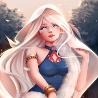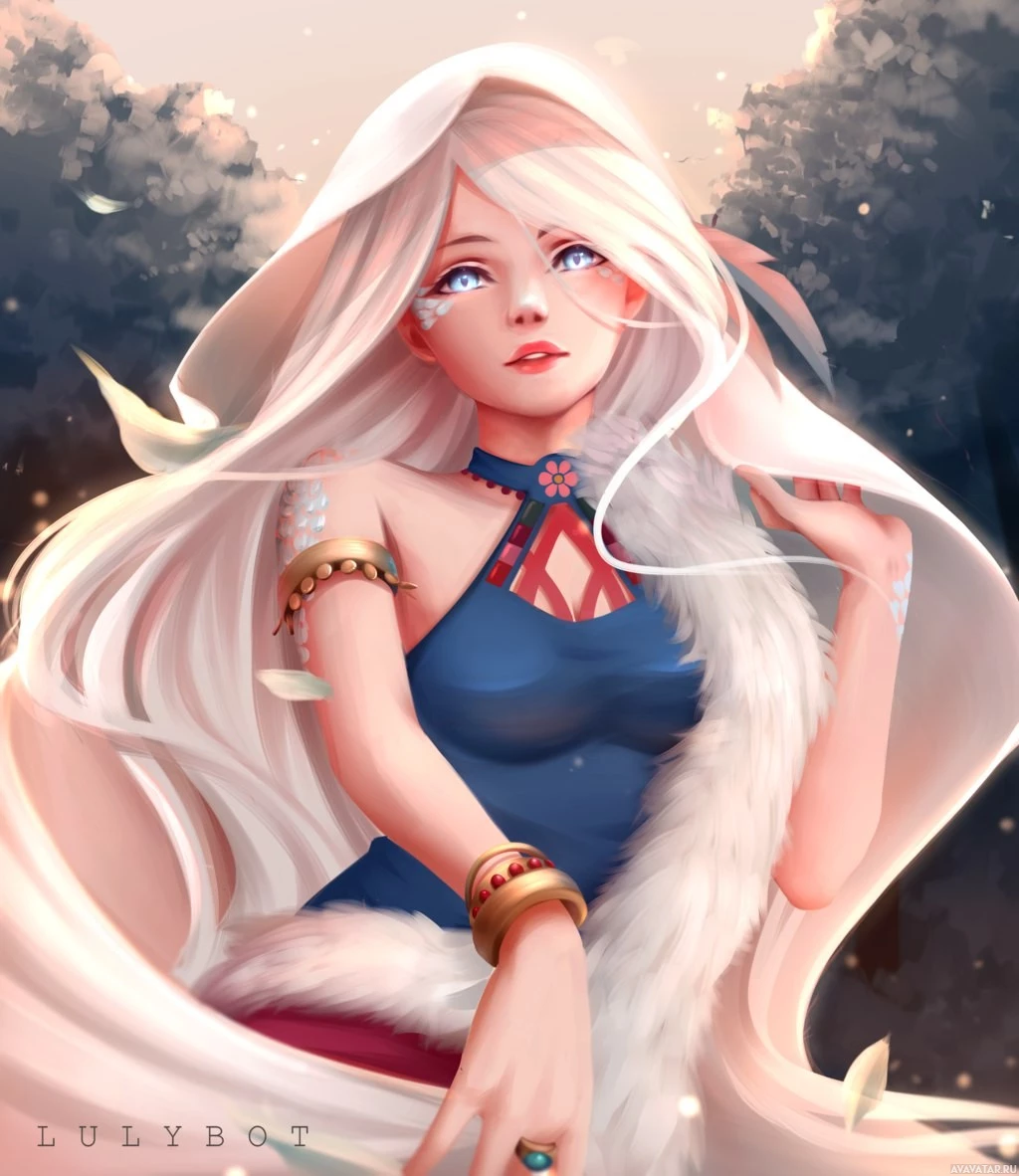blue eyes and is wearing what appears to be an armor or protective clothing with a fur lining. She also has some