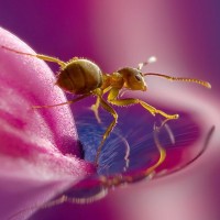На картинке изображен маленький муравей с отличительными красными и черными отметинами на теле, ползающий по краю розового цветка. Это пример фотографии крупным планом, которая фиксирует детали и текстуры, которые обычно не видны невооруженным глазом.