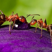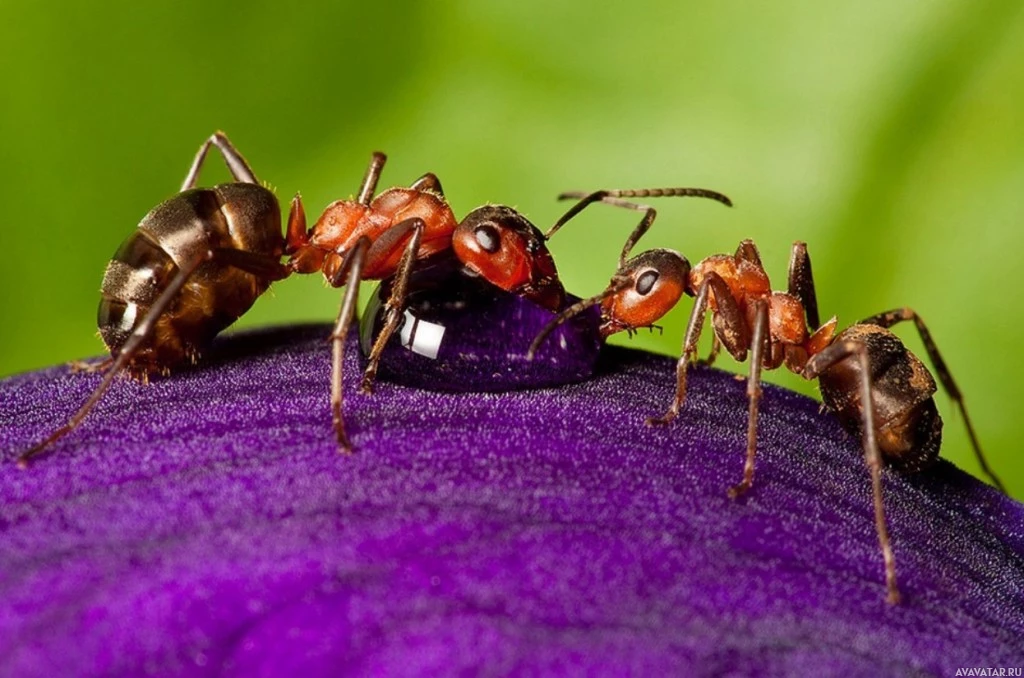 На снимке изображены два муравья, взаимодействующие с каплей воды. Они, по-видимому, находятся в процессе сбора или совместного использования воды, что является общим поведением среди муравьев, поскольку они часто работают вместе, чтобы найти и поделиться ресурсами для выживания. Муравьи известны своим социальным поведением и способностью общаться друг с другом через феромоны и физический контакт.