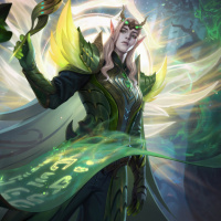 elven nature. The background is vibrant, with green and yellow hues that give off an almost ethereal or magical atmosphere. This combination of the character's appearance and the background suggests a setting within a fantasy-themed universe. The artwork is detailed and vivid, showcasing a high level of craftsmanship typical in