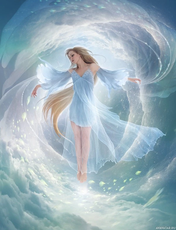 a female character with long blonde hair, floating in the air above a spiral of light or energy. She is wearing a flowing,