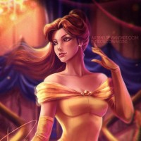 red hair styled in a way that frames her face, wearing her classic yellow dress with a corset-style bodice. The background suggests a warm,
