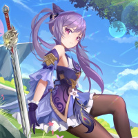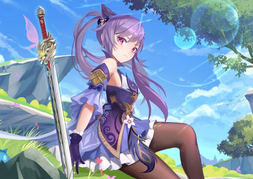 purple hair and is wearing a fantasy-style outfit that suggests she might be a warrior or a character skilled in combat. The character is holding a sword, which further emphasizes her role as a fighter within the game. The background includes elements of nature like clouds and trees, adding to