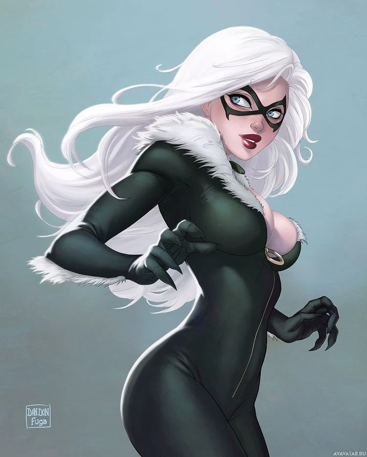 an outdoor setting. Her pose is dynamic, with one hand resting on her hip and the other pointing downwards towards what appears to be a puddle or pool of water. The character's attire includes a black leather cat suit and fur trim, which are elements that contribute to her distinctive look as