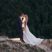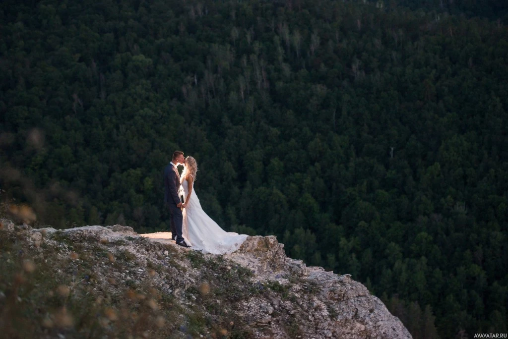 a romantic moment on a hilltop, presumably as part of their wedding celebration. They are both dressed in wedding attire, with the man wearing a suit and tie and the woman in