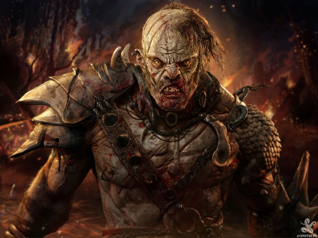 a fantasy character that appears to be an orc. This character is depicted with a gruesome and disfigured appearance, including scars, burns, and possibly